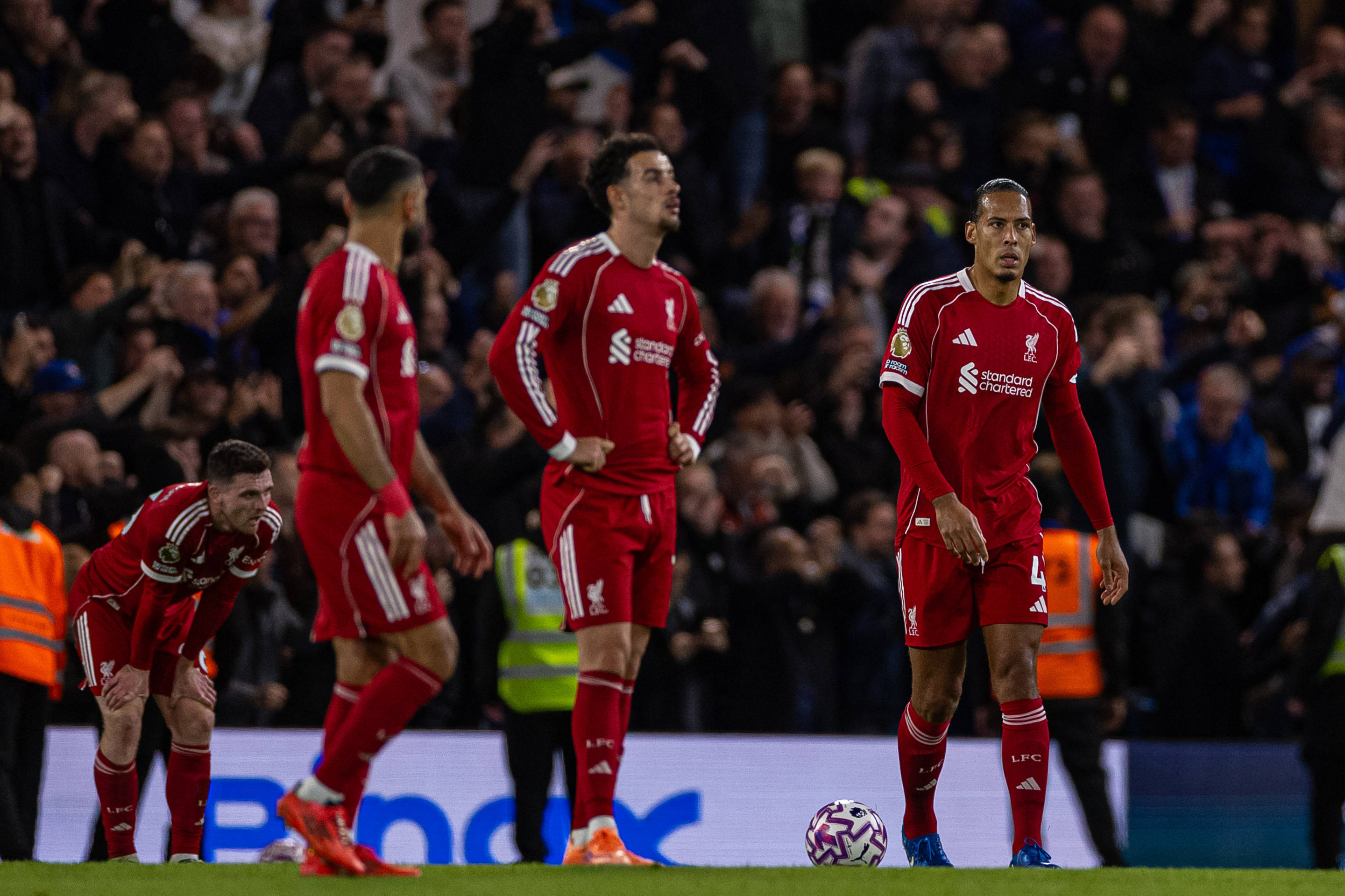 10月4日,利物浦队球员在切尔西队补时阶段进球完成绝杀后神色落寞。 新华社发