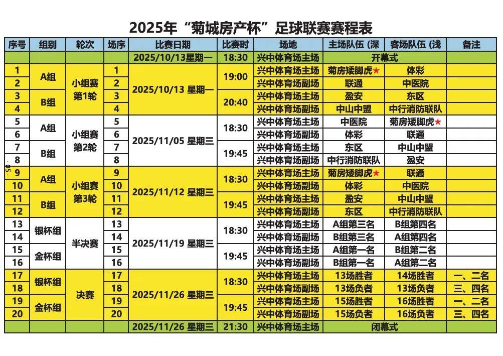 从今晚的开幕式揭幕战开始,后续比赛将每逢周三晚上举行,为中山市民的每周生活注入满满的足球激情。所有比赛均免费向公众开放,欢迎广大球迷亲临兴中体育场,为自己支持的球队加油助威!