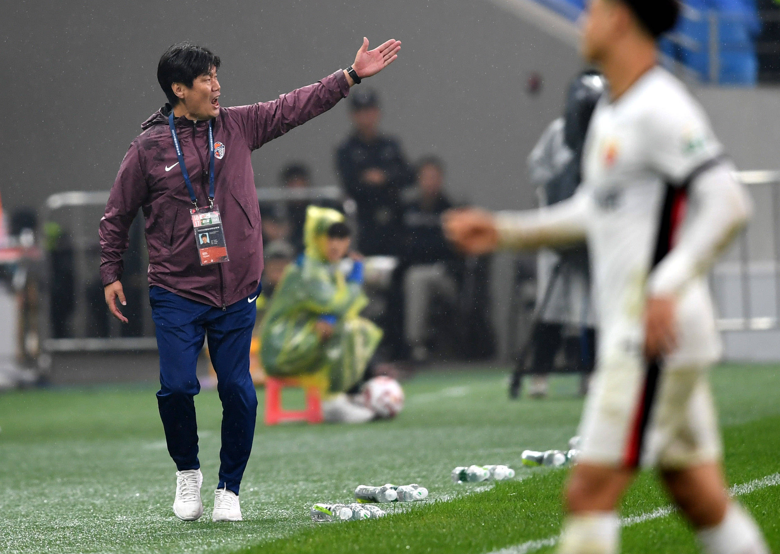 10月17日,上海海港队主教练穆斯卡特(右)在比赛中指导球员。 新华社记者 李紫恒 摄