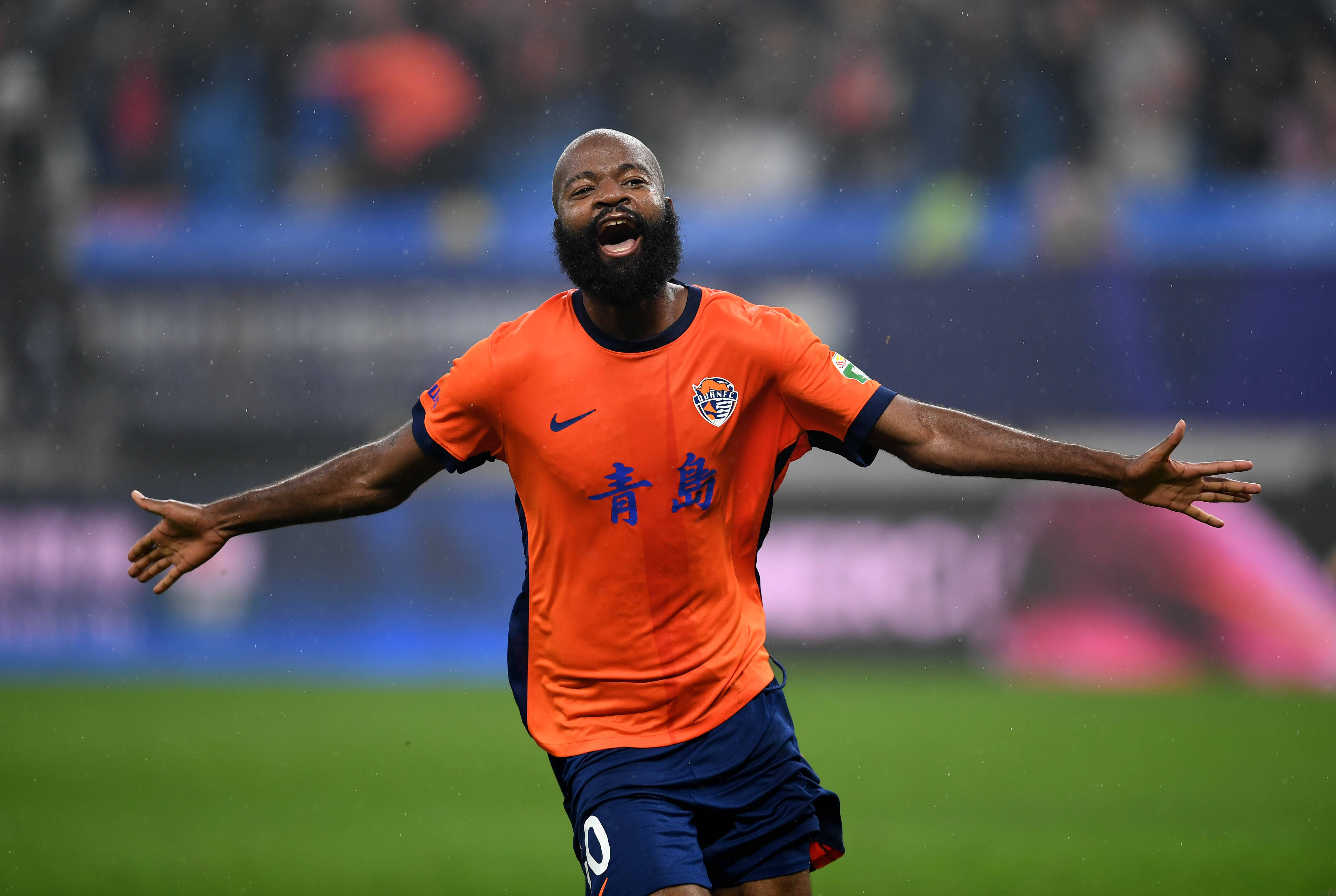 10月17日,青岛海牛队球员兰克尔泽在进球后庆祝。 新华社记者 李紫恒 摄