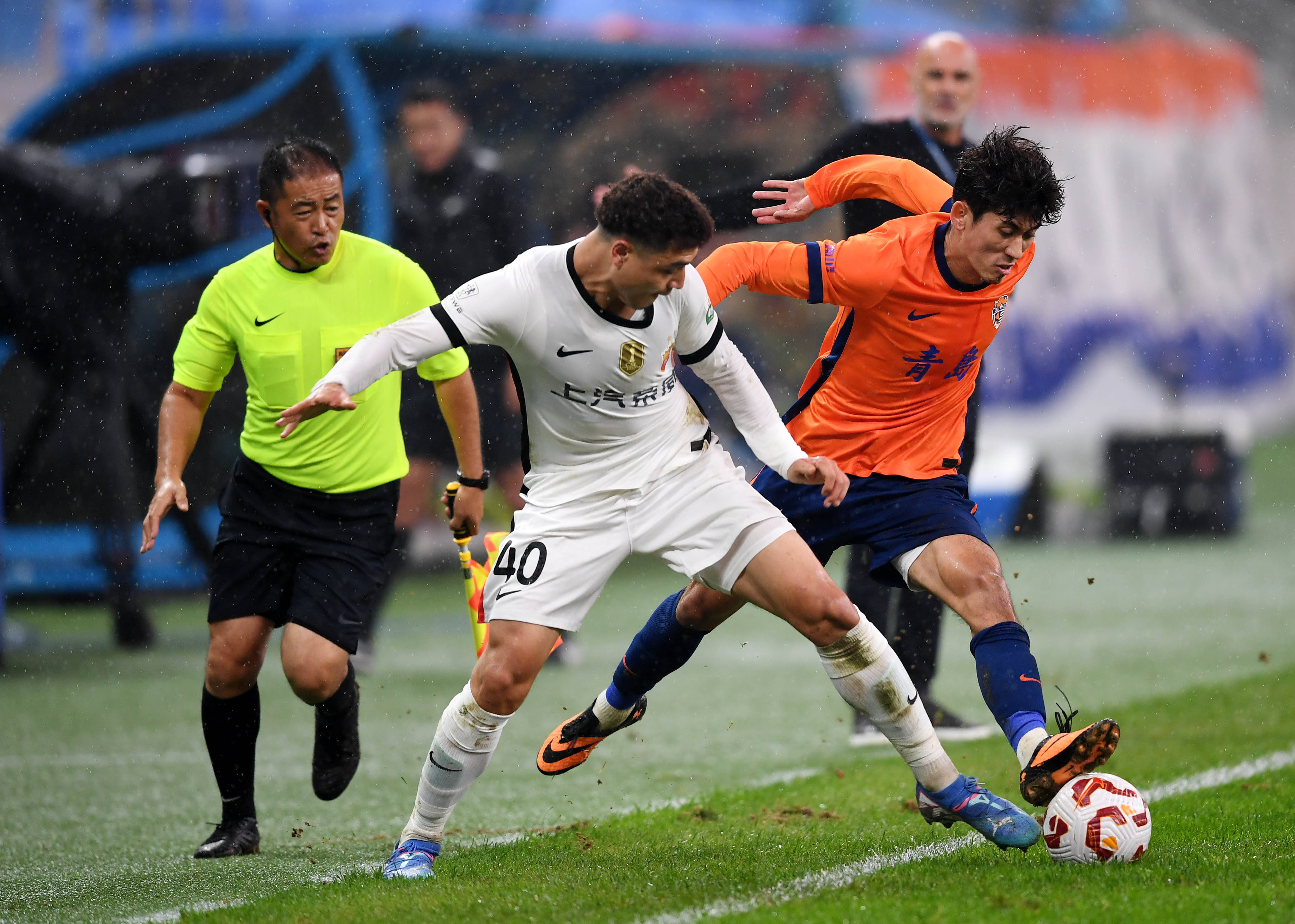 10月17日,上海海港队球员吾米提江·玉苏普(前)在比赛中与青岛海牛队球员兰克尔泽拼抢。 新华社记者 李紫恒 摄
