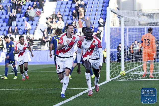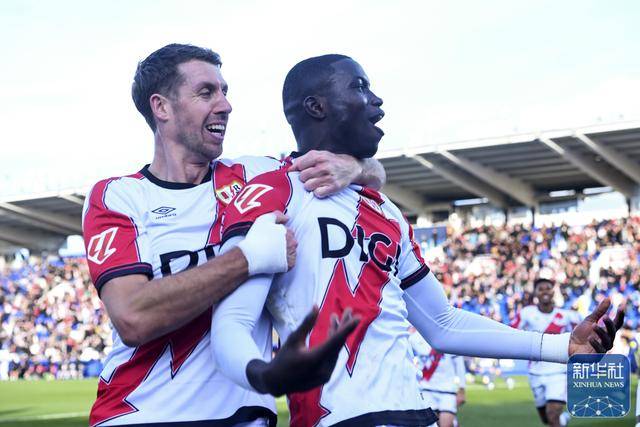 ↑ 巴列卡诺队球员诺贝尔·门迪(右)在比赛中与队友弗洛里安·勒戎庆祝进球。