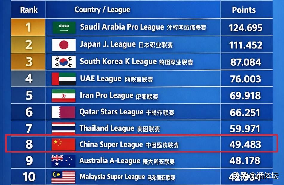反观榜单的其他位置,日本J联赛、韩国K联赛以及澳大利亚A联赛依旧稳居前列,展现出其深厚的足球底蕴。而新加坡联赛,凭借其在亚冠二级联赛中的亮眼发挥,积分更是大幅攀升了14.167分。值得注意的是,在亚冠精英赛中,如泰国超级联赛、马来西亚超级联赛等曾经不被看好的联赛,也凭借近年来持续惊艳的表现,斩获了可观的积分。