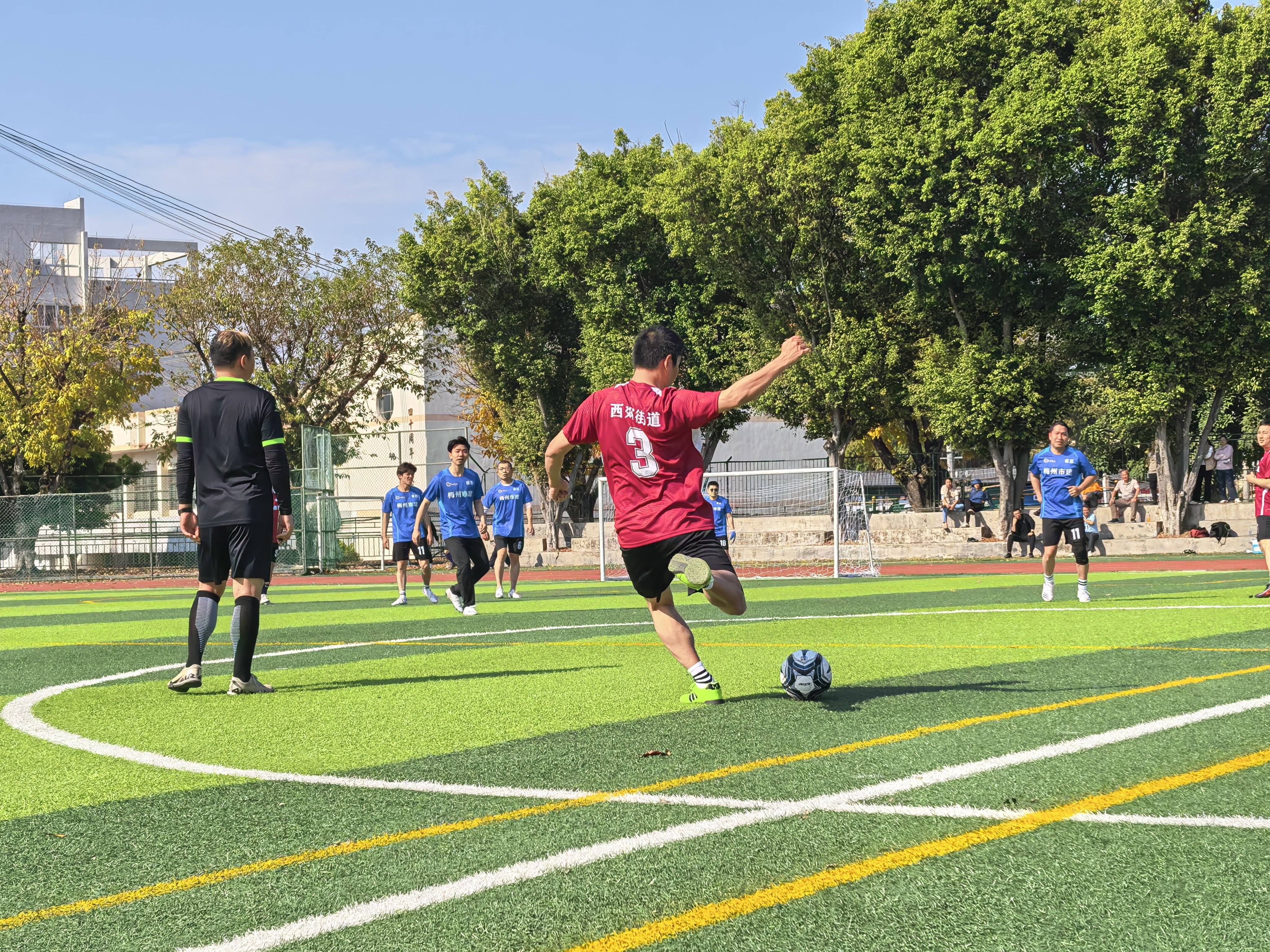伴随着激昂的旋律,各参赛队伍精神饱满、整齐列阵,展现出昂扬向上的精神风貌。简短而热烈的开幕式后,姚文顺与街道领导一起走到球场中央,在全场观众的倒数声中,共同踢出了象征活力与希望的 “第一球”!现场掌声、欢呼声震天——西郊街道首届“睿思杯”村级足球联赛,正式开赛。