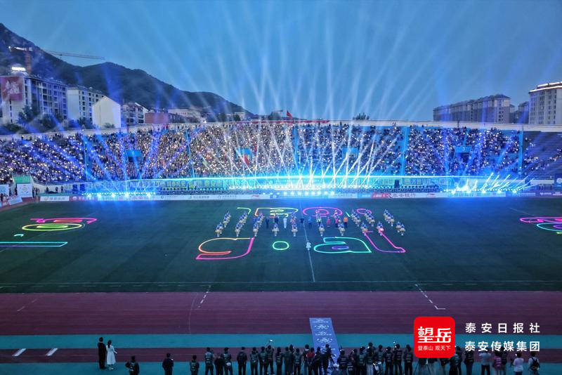 揭幕式现场,《国泰民安》《追梦泰安》《大美山东》以及灯光秀等文艺展演精彩不断、激情澎湃,瞬间点燃全场热情;16地市队旗入场、揭幕战双方球队入场亮相等环节引得全场观众鼓掌欢呼,将现场气氛再次推向高潮。