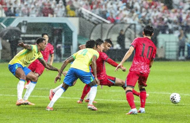 比赛中,韩国队在大雨中进行,开场阶段虽然顶住了巴西队的一些进攻,但在面对对手高压逼抢时,韩国队的传球出现了不少失误。第12分钟,巴西队通过一次精准的直传,由埃斯特旺破门,巴西队1-0领先。即使失球,韩国队依然保持了进攻节奏,但多次传球失误让防线压力倍增。特别是曹侑珉和金朱晟的失误更是暴露了防守端的漏洞。第40分钟,巴西队利用“二过一”配合再度得手,2-0领先。